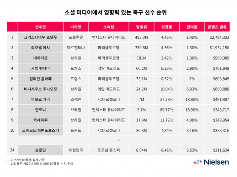 ✅ 미국의 데이터 업체 닐슨사가 월드컵 기간 도중 소셜 미디어에서 영향력 있는 축구 선수 순위를 발표했습니다. 닐슨 사는 각 선수들 계정의 팔로워, 성장률, 참여율, 콘텐츠 가치를 분석하고 종합해 순위를 정했다고 밝혔습니다.